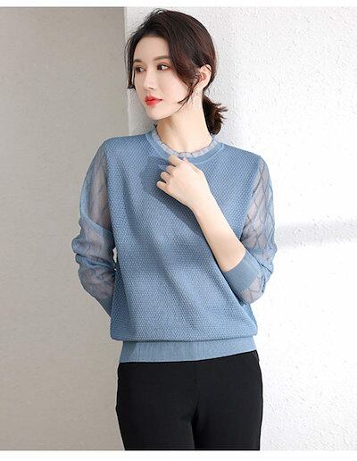 フリル襟ニットセーターレディース切り替えニットニット長袖セーターレース切り替えセーターニットソーラウンドネック重ね着風透け感スリーブ長袖ニットトップスプルオーバーカットソー秋カジュアル通勤キレカジカシ | coolcoool