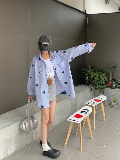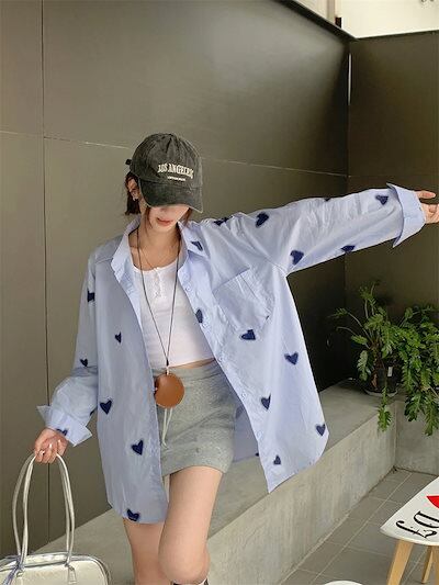 上着 ブラウス シャツ トップス 秋冬トップス シャツ 長袖 ボタン 襟 スタンダードカラー ハート 秋 ブルー 青 おしゃれ かわいい ガーリー キュート ラブリー 甘め 韓国ファッション レディ | coolcoool