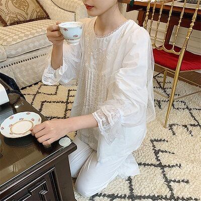 大人気 上品パジャマ レディース セットアップ ルームウェア 上下セット レース リボン リネン フレア 寝巻き 長袖 ロングパンツ 2点セット 綿 女性 可愛い 部屋着 ホワイト | coolcoool