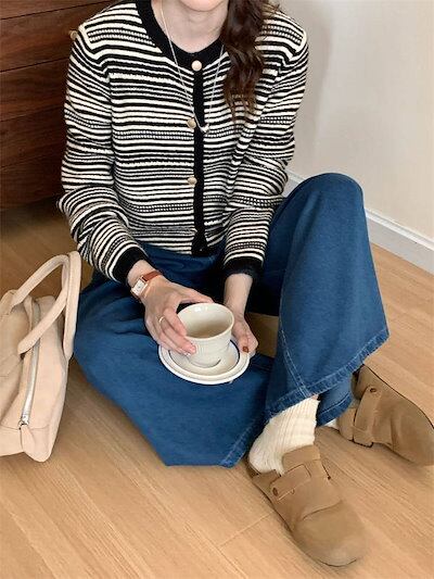 カーディガン レディース 秋冬 ボーダー 春 配色 ゆったり カジュアル おしゃれ 秋 長袖 ニットカーディガン ニット カーディガン トップス ニット シャツブラウス ジャケット 体型カバー 重ね着 | coolcoool