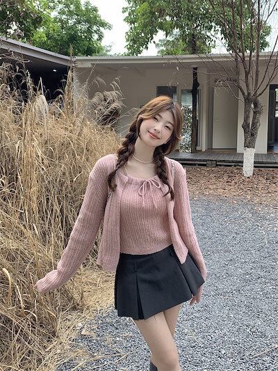2024 秋冬かわいい人気 トップス 長袖 ニット無地レディースショート 羽織りファッション系 ルーズ ネック女っぽカジュアルボレロゆったり 大人っぽ春セーターフレンチ型 2点 | coolcoool