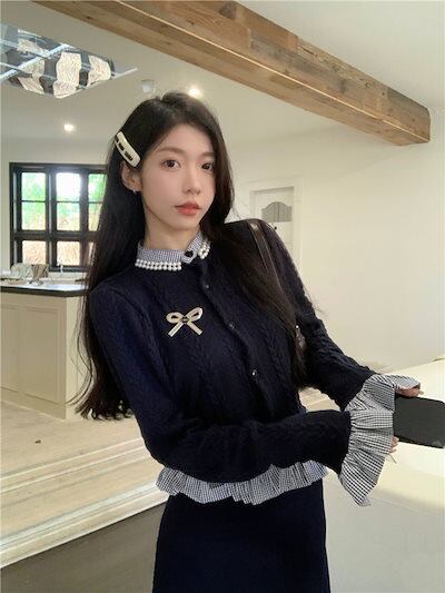 2024秋冬トップス シャツ ニット ボタン 重ね着風 二枚重ね 長袖 ゆったり 秋 おしゃれ かわいい キュート 甘め 韓国系ファッション レディース お出かけ丈