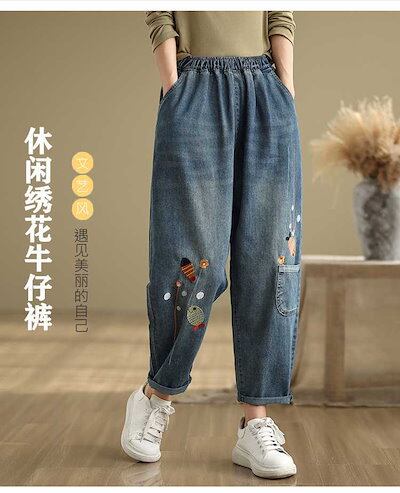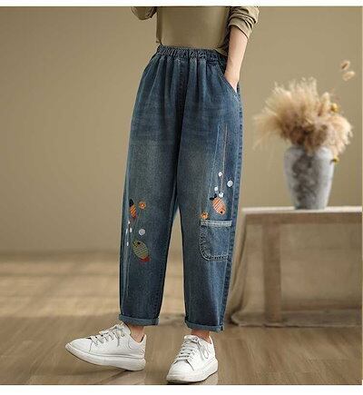「ファットガール」 2024秋冬新品 刺繍 デニムパンツ 大きいサイズ 体型カバー ゴム ジーンズ テーパードパンツ レディース メガ割