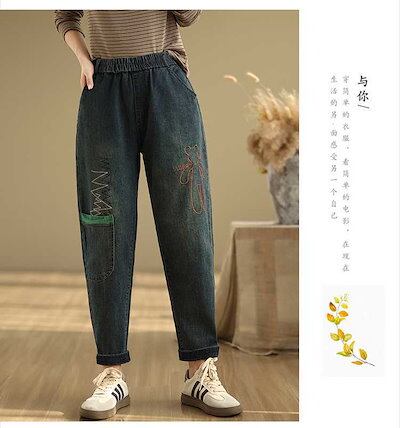「ファットガール」 2024秋新品 デニムパンツ 刺繍 大きいサイズ 体型カバー レディース ゴム ジーンズ メガ割