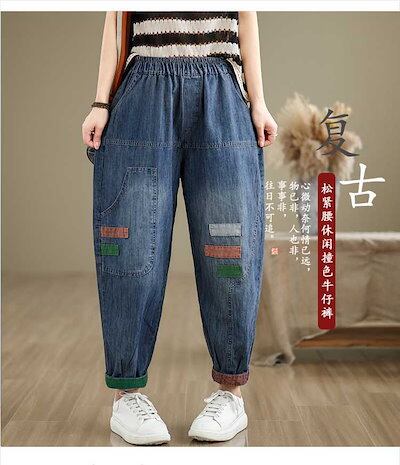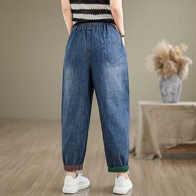 「ファットガール」 夏 刺繍 デーパードパンツ 薄手 デニムパンツ ジーンズ ゴム 体型カバー 大きいサイズ ゆったり レディース