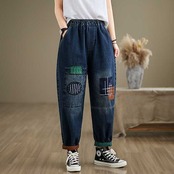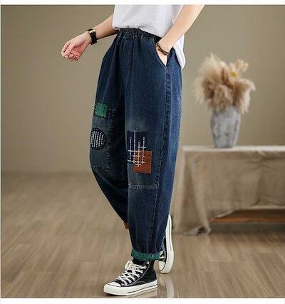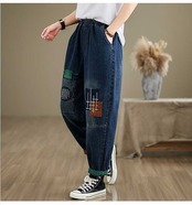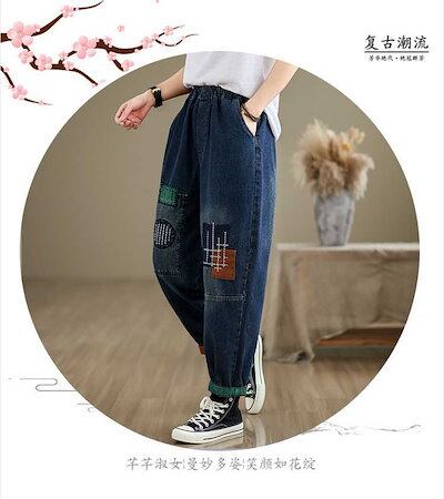 「ファットガール」 夏 ダメージデニム デニムパンツ ジーンズ ゴム 九分丈 刺繍 薄手 ワイドパンツ デーパードパンツ 体型カバー 大きいサイズ ゆったり レディース