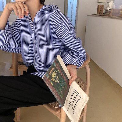 シャツ レディース 長袖 おしゃれ ストライプシャツ トップス ストライプ ブルー 柄 S M ブラウス 体型カバー オーバーサイズ ビッグシルエット ルーズシルエット 通勤 オフィス OL きれいめ | coolcoool