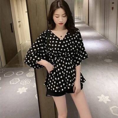 トップス レディース ブラウス チュニック 長袖 Vネック ドット 柄 薄手 春 夏 秋 大人