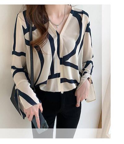 トップス レディース ブラウス 長袖 Vネック 柄 春 夏 秋 大人 かわいい 上品 きれいめ お洒落