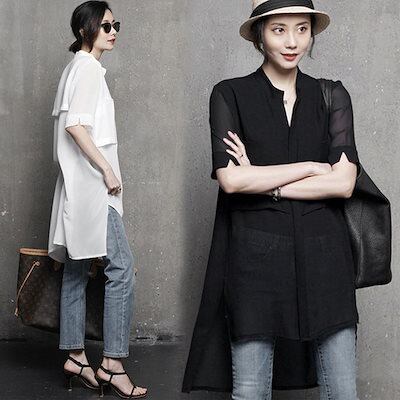 シャツブラウス 夏 ロング丈 チュニック 半袖 ブラウス ロングシャツ シフォン 無地 体型カバー ゆったり 前後差 シースルー シンプル カジュアル オシャレ 通勤