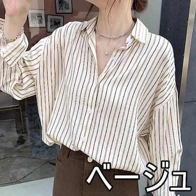 トップス レディース ブラウス 個性的 長袖 ストライプ 柄 ベージュ グレー M L XL 2XL