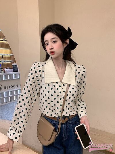 2024 春夏トップス シャツ 長袖 バブル袖 ドット柄 Vネック 襟 ボタン 春 白 ホワイト かわいい キュート ガーリー 甘め おしゃれ 韓国ファッション レディース お出かけ | coolcoool