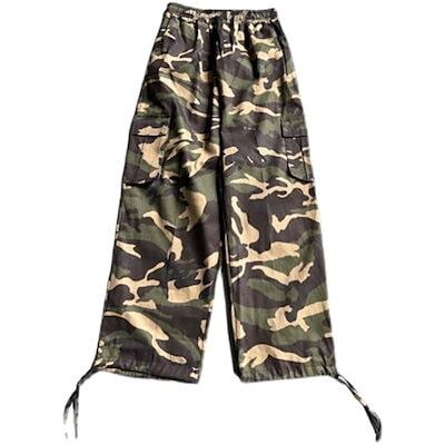 【3日以内出荷】かっこいい!スラックスパンツワイドパンツシルエットで魅せる 超 ワイド 迷彩 カーゴパンツ ダボかわ ストリート メンズライク ワイルド カジュアル 裾ドローコード バギーパンツ 古着