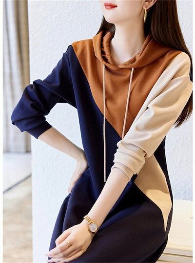 パーカーワンピース レディース 春 秋 長袖 きれいめ フード付き ワンピース バイカラー スウェット 膝丈 切り替え マルチカラー カジュアル ゆったり ロング丈 切り替えワンピース 体型カバー 春 | coolcoool