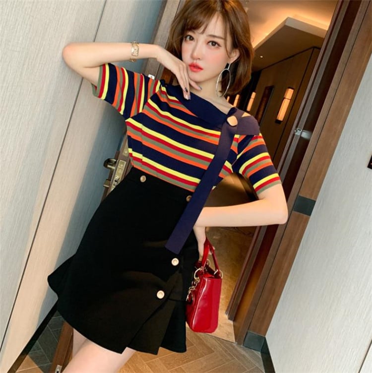 女性美up 牧歌的なスタイル ボタンスカートオフショルダー ストライプ ニット半袖 トップス セット