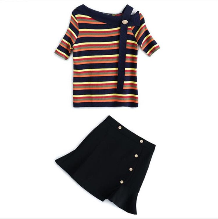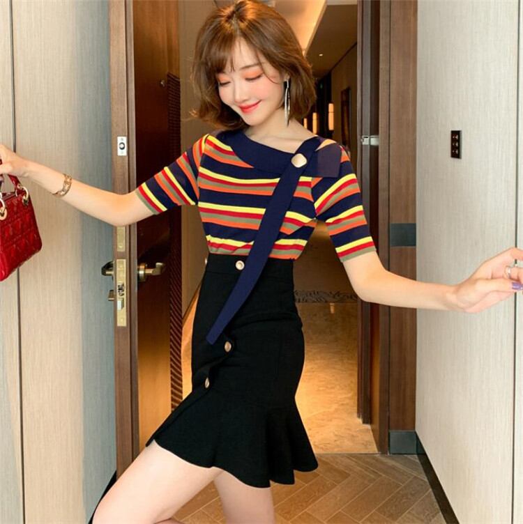牧歌的なスタイル セット オフショルダー 色 ストライプ ニット 半袖 トップス+ボタン フリル スカート