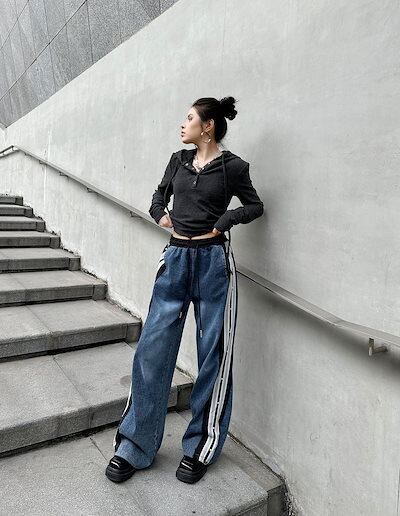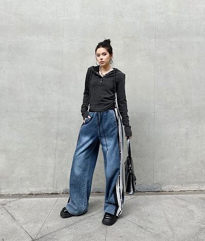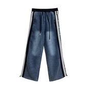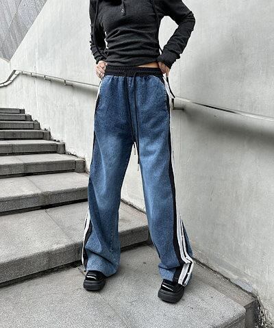 【J.Fashion】 デニムパンツ レースドッキング ジーンズ ロングパンツ レディース ゴム フレア ワイドパンツ 関連商品購入可能 メガ割