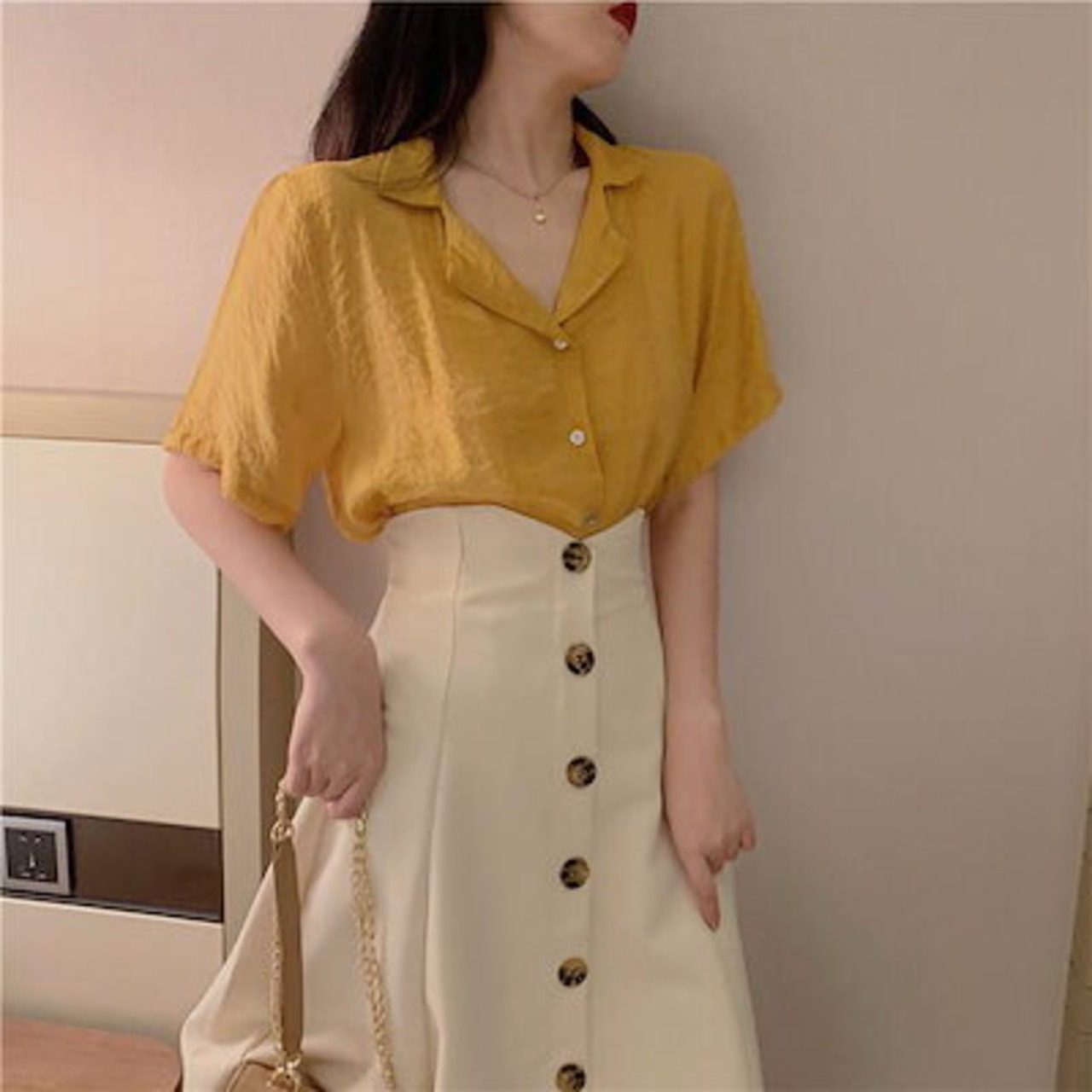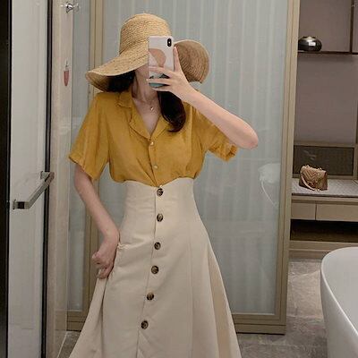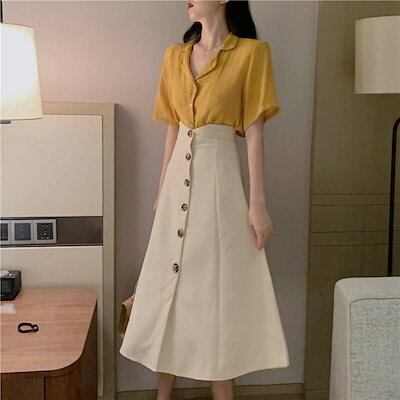 セットアップ レディース 半袖 シャツ ブラウス ミディ丈 スカート 2点 上下セット トップス ボトムス ツーピース 開襟 無地 シンプル フロントボタン ハイウエスト Aライン 普段使い お出かけ | coolcoool