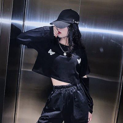 レディース ロンT パンツ 上下 トップス ボトムス セット アップ 2点 セット ツーピース 長袖 半袖 ボタン 袖あり ラウンドネック 蝶 ウエストゴム ハイウエスト 黒 韓国 穴あき 無地 | coolcoool