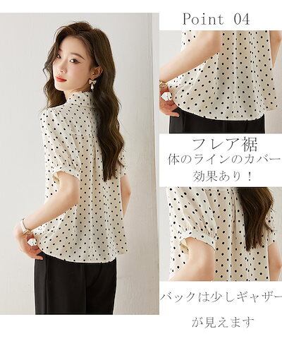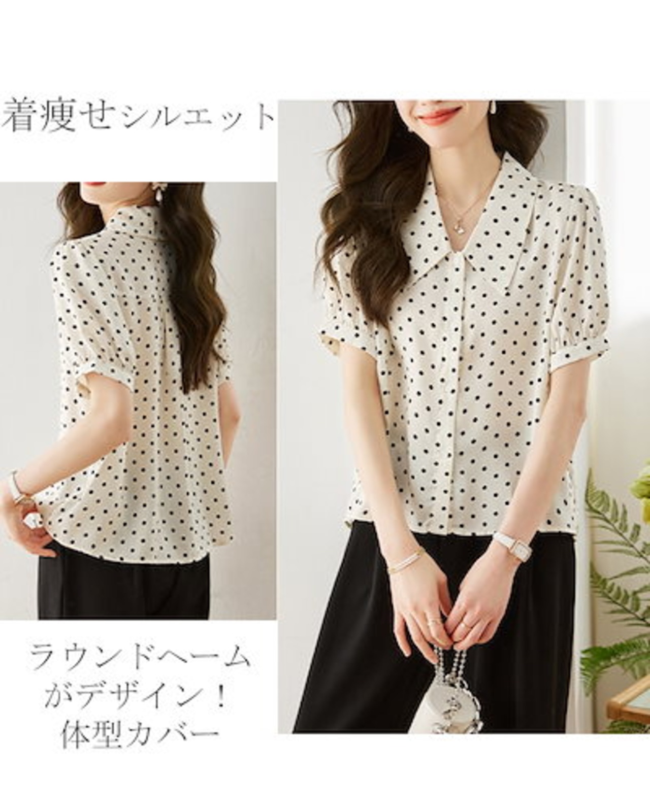 水玉模様 袖ギャザー シャツ ブラウス レディース 春夏 シャツブラウス フォーマルシャツ 半袖シャツ ドット 折襟 Vネック 半袖 ギャザー ビジネススーツ オフィスウェア トップス ボタン留め 前 | coolcoool