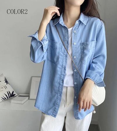 長袖&半袖選べる デニムシャツ ブラウス 春夏 デニムブラウス シャツ 折襟 ポケット付き 長袖 半袖 タック レディース フォーマルシャツ ビジネススーツ オフィスウェア トップス デニム ボタン | coolcoool