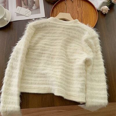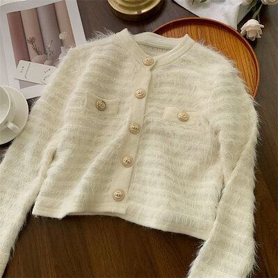 カーディガン レディース 春 秋 冬 ニットカーディガン 長袖 トップス ニット 羽織 アウター ジャケット ノーカラージャケット ショート丈 暖かい アウター 前開き 防寒 シャギーニット 体型カバ | coolcoool