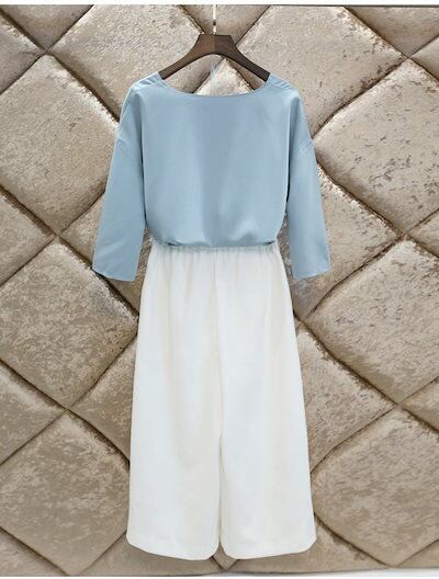 2点セット オールインワンに見えてレディーストップス レディースブラウス 夏秋 シンプルライン 2タイプ お得な上下2点セット/半袖/ネック/正装/ガウチョパンツ/ストライプ/着痩/ブルー 白 | coolcoool