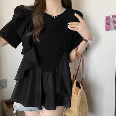 トップス 韓国ファッション フリルブラウス tシャツ ティーシャツ ティシャツ tシャツ 半袖 チュニック イレギュラー 体型カバー カットソー 韓国レディース半袖 大きいサ ロゴT | coolcoool