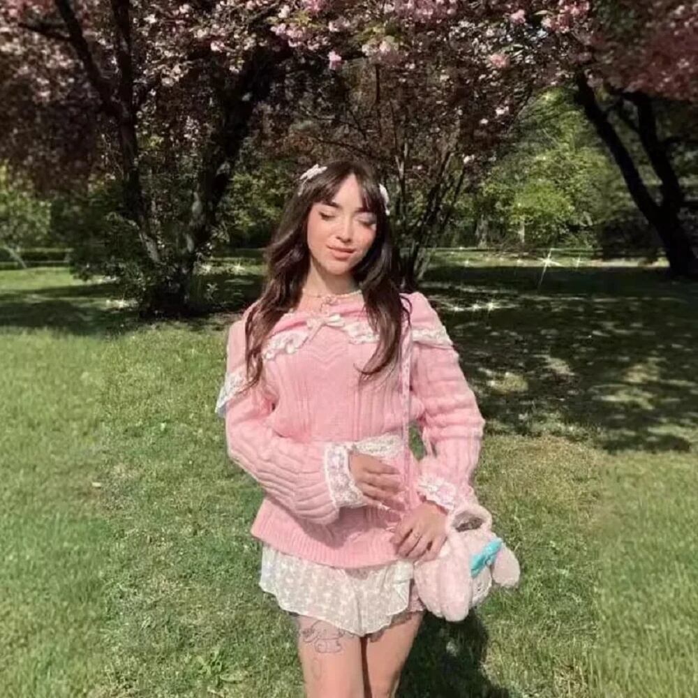 女性の裸の肩のレースのパッチワークプルオーバー、ピンクのセーター、長袖、ニットジャンパー、甘いストリートウェア、弓、かわいい、ピンク、y2k パーカー ジャージ y2k T240908135905_01 | coolcoool