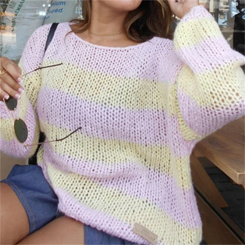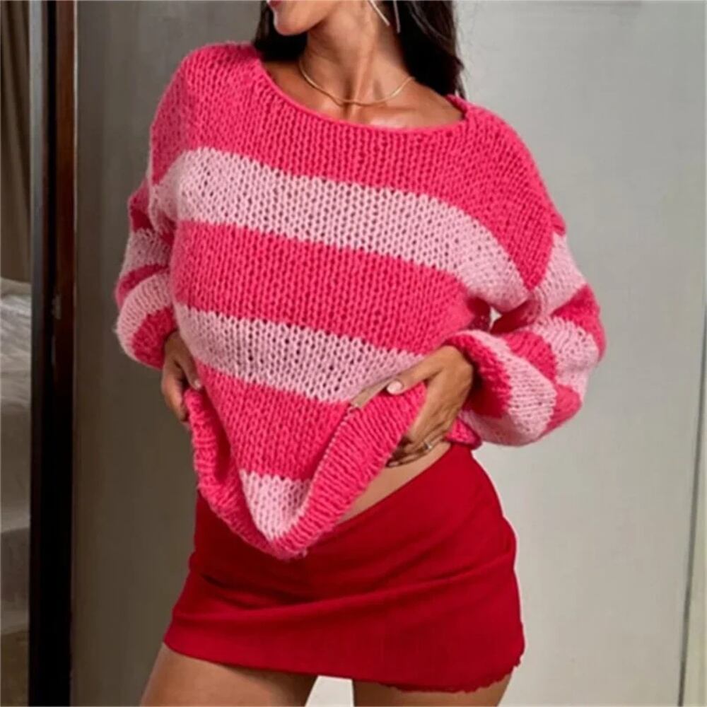 女性用特大ストライプセーター、ルーズセーター、ニットセーター、長袖、y2kプレッピージャンパー、ニットストリートウェア、カラーブロック パーカー ジャージ y2k T240908135931_02 | coolcoool